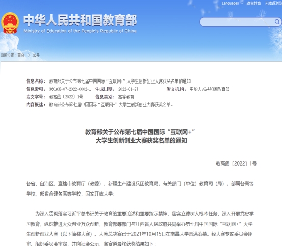 据悉,此次中国国际“互联网+”大学生创新创业大赛由教育部等12个中央部委单位和江西省人民政府共同主办,聚焦建党百年,以“我敢闯、我会创”为主题,围绕“更中国、更国际、更教育、更全面、更创新”的办赛目标,主动融入全球创新创业浪潮,得到了国内外的高度关注,共有来自121个国家和地区的4347所院校、228万余个项目、956万余人次报名参赛,大赛催生出众多高质量项目和前沿成果,为推动高校毕业生高质量创业就业贡献力量。