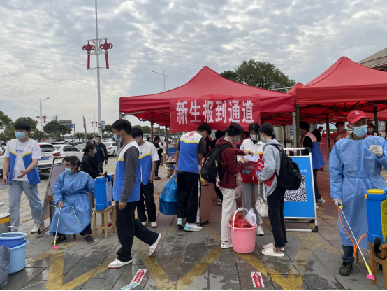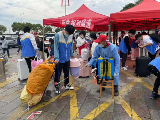 新生返校期间,学院党委书记、院长曹端荣,副院长王义林、詹绍成亲临现场指导新生返校工作。工作人员按照疫情防控要求,规范流程,设置行李消杀区、身份核验区、体温检测区、更换口罩区、健康联合码检查区。校卫队引导送新生的车辆在指定区域卸运行李,再指引新生前往报到通道。志愿者落实“一扫一测三查验”工作,督促返校新生在身份核验区保持安全距离,在更换口罩区洗手消毒,更换口罩,有序入校。