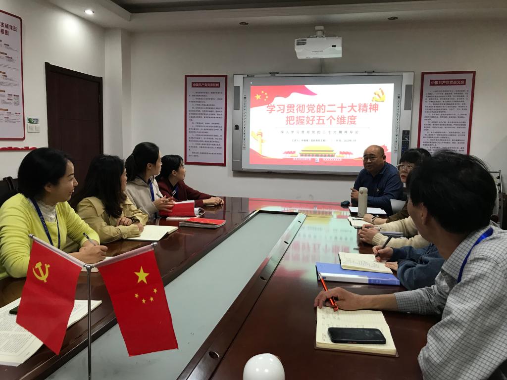 为深入贯彻落实党的二十大精神,提高思政教师政治站位,推动党的二十大精神进校园、进课堂、进头脑,11月2日,思政部党支部在支部活动会议室召开全体党员大会,支部书记冷晓海进行一堂题为《学习贯彻好党的二十大精神 把握好五个维度》的党课报告,此次报告内涵丰富、案例鲜明、道理深刻,全体党员同志现场聆听、认真记录、深入讨论,学深悟透党的二十大精神。
