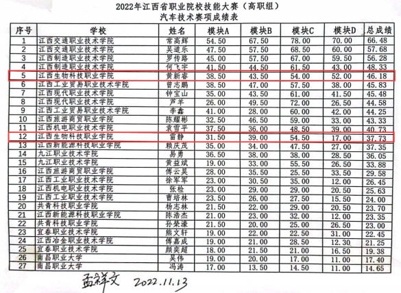 11月11日至13日,2022年江西省职业院校技能大赛汽车技术赛项在江西交通职业学院举行,来自全省14所高职院校共27个参赛队同台竞技,我院机电工程系黄新睿、雷静两位同学参赛,经过三天的激烈角逐,黄新睿获得了省二等奖,雷静获省三等奖。