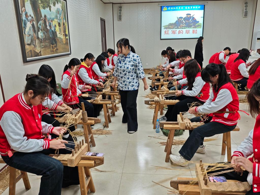 当日下午,"学编红军草鞋" 体验教学将活动推向高潮。学员们手持稻草,在民间艺人的指导下搓绳、编织、固定,亲手制作出一双双粗糙却承载着革命记忆的草鞋。指尖触碰到稻草的坚韧纹理,大家纷纷联想到当年红军穿着草鞋跨越雪山草地、突破敌人封锁的壮举 —— 这双双草鞋不仅是艰苦奋斗的象征,更是军民同心的见证。