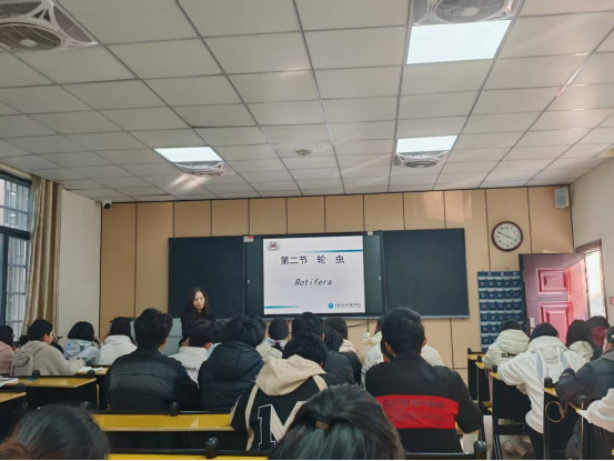 课堂上,刘红教授以“轮虫”为授课主题,依托PPT、高清图片、动态视频及三维动画等多元教学资源,从外部形态的细微特征到内部构造的功能分区,从独特的生殖方式到完整的生活周期,层层递进地展开系统讲解。授课过程中,刘红教授通过提问互动引导学生主动思考,现场学习氛围浓厚。