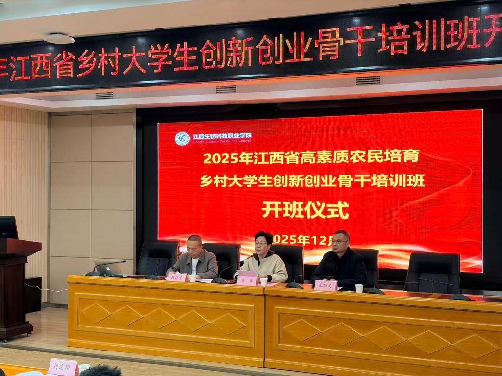 初冬赣鄱,硕果飘香。12月1日,江西省高素质农民培育乡村大学生创新创业骨干培训班在南昌正式开班。来自全省各地的 50 名乡村大学生创新创业骨干齐聚英雄城,开启“充电赋能”之旅。江西省农技推广中心科技生态处正处级干部潘华处长、学院党委委员、副院长王加文参加开班仪式。