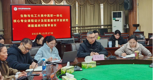 为推进江西省生物与化工大类中高职一体化核心专业课程体系建设及配套教材开发工作,进一步规范教材编写格式、提升教材编写质量,12月27日,学院组织召开课题组教材编审专题会议。学院党委委员、副院长王加文出席会议并讲话,教务处副处长及课题组全体教材编写人员参加会议。