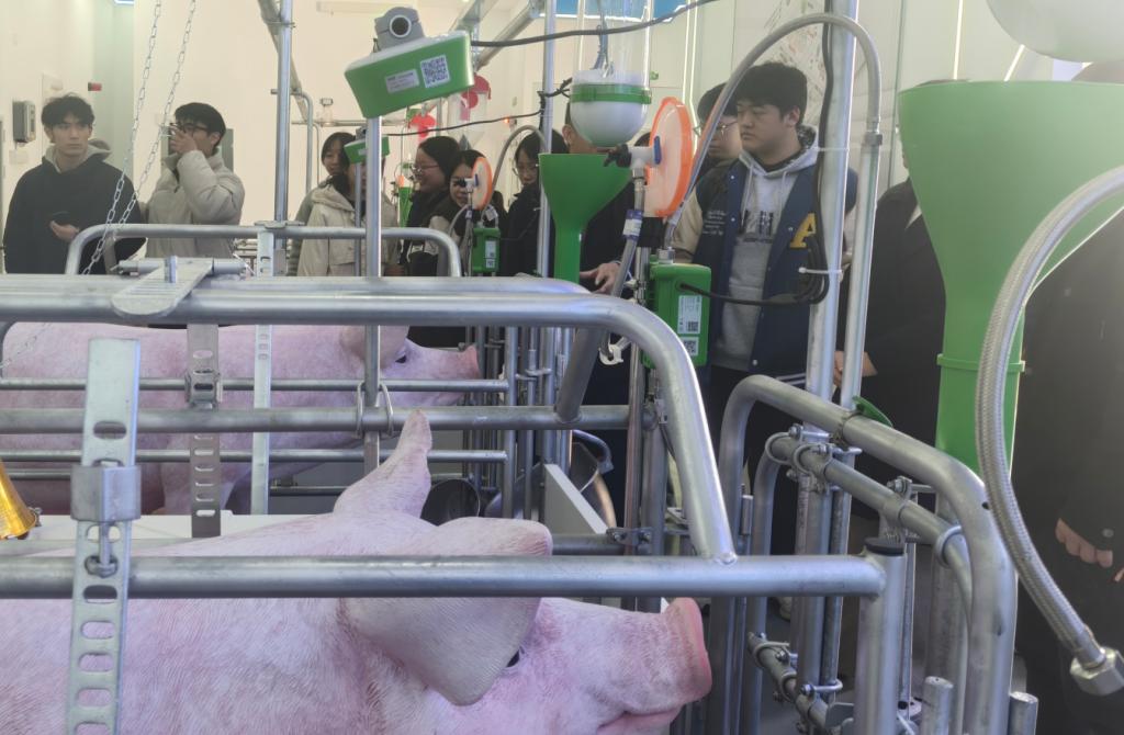 在实训中心技术人员的引导下,师生一行先后参观了生物安全区、精准通风间、配种间、分娩间、育肥间等关键区域。调研现场,智能饲喂系统可根据猪群生长阶段精准配比饲料,实现全封闭管链运输与自动化投喂;该系学子结合自身专业知识,围绕“AI图像识别在猪只估重中的应用”、“养殖大数据分析模型构建”等问题,与技术人员展开深入探讨,现场学习氛围十分浓厚。