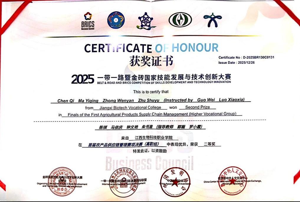 近日,2025 一带一路暨金砖国家技能发展与技术创新大赛首届农产品供应链管理赛项(高职组)决赛落下帷幕。我院参赛团队表现优异,斩获二等奖。