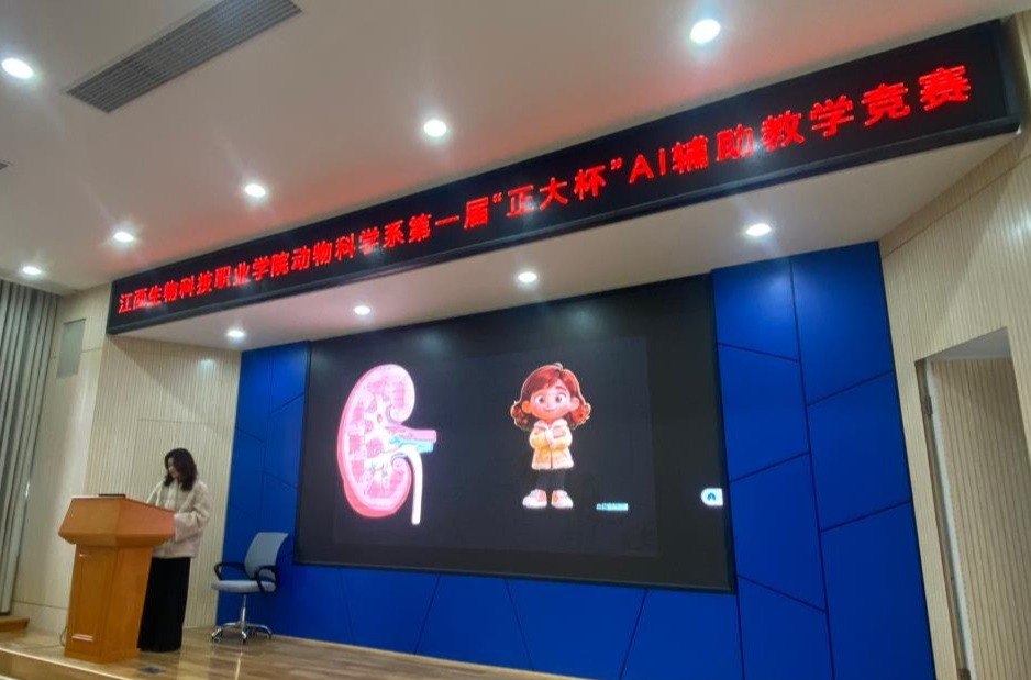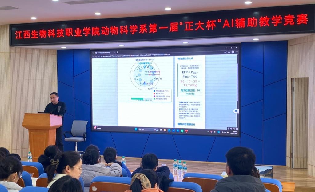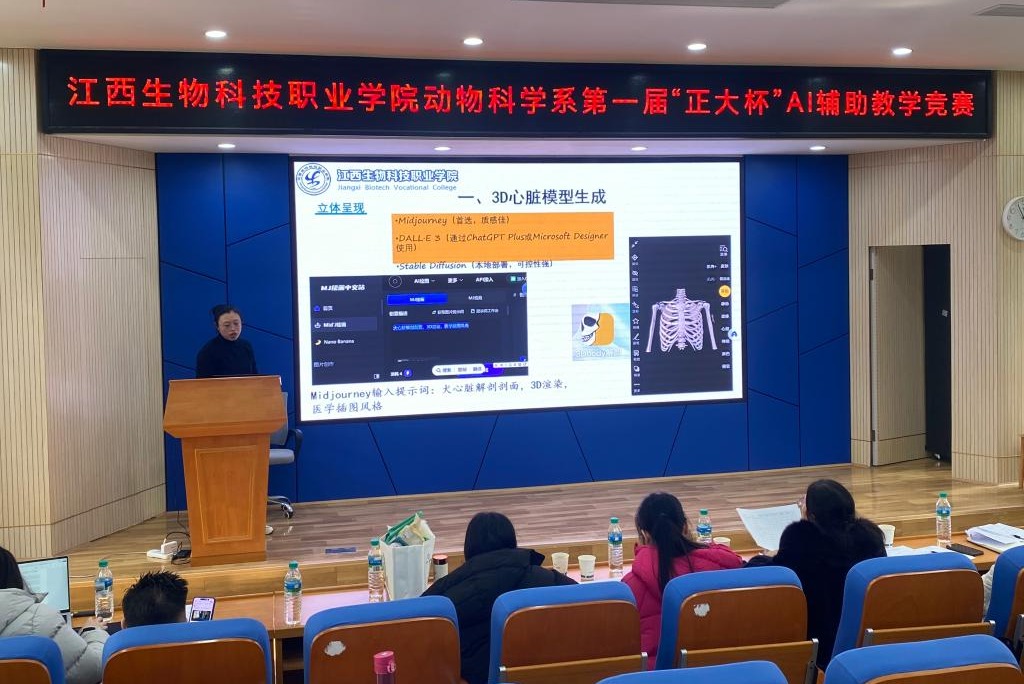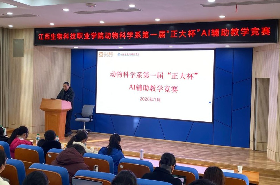 为积极响应教育数字化战略行动,推动人工智能与教育教学深度融合,近日,江西生物科技职业学院动物科学系在图书馆学术报告厅成功举办首届“正大杯”AI辅助教学竞赛。全系教职工参与,系部青年教师同台竞技,校内知名专家担任评委,现场展示了AI技术赋能专业教学的创新实践。本次竞赛得到江西正大畜禽有限公司的大力支持,这是系部持续推进校企合作走深走实的生动体现。