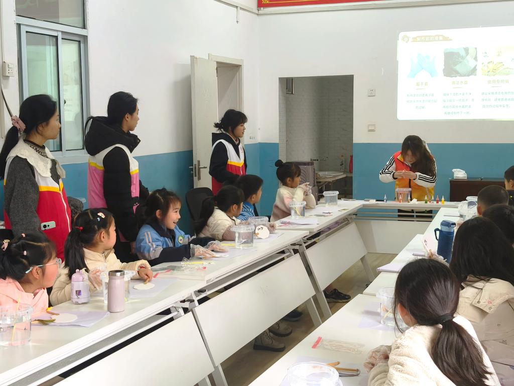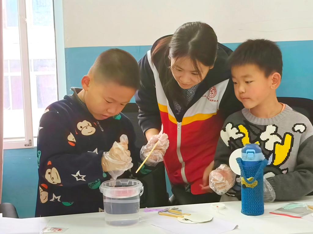 志愿者通过PPT与实物展示,为孩子们讲解漆扇的历史渊源、工艺特点及文化内涵。实践环节,孩子们在志愿者的耐心指导下,亲手调色、滴漆、晕染,体验漆扇制作的全过程。一把把素白的扇面,在孩子们的巧手下逐渐呈现出斑斓的图案,展现出传统工艺与童真创意的巧妙融合。孩子们手持自己制作的漆扇,与志愿者们在户外合影留念,记录下这充满文化气息的美好时刻。