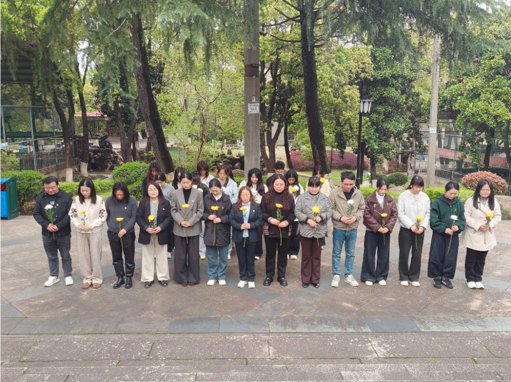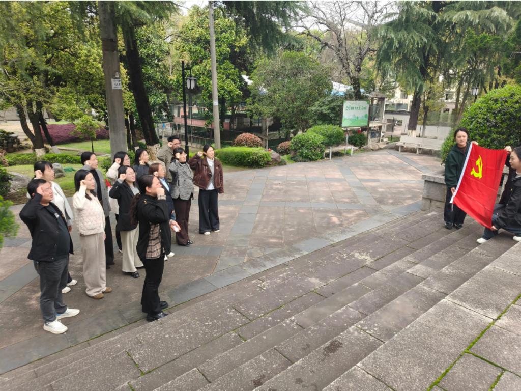苍松翠柏掩映下的烈士纪念塔巍然耸立,现场气氛庄重肃穆。活动在庄严的仪式中开始,党支部首先向烈士纪念塔敬献花篮,党支部书记仔细整理缎带。全体人员静默肃立,向为民族解放和人民幸福英勇献身的革命先烈致以深切哀思。随后,党员们手持鲜花,依次缓步绕行,瞻仰纪念塔,追思先烈功绩。在纪念塔前,面对鲜红的党旗,全体党员重温入党誓词,铿锵有力的誓言回荡在纪念地上空,表达了对党忠诚、为党和人民事业奋斗终身的坚定信念。