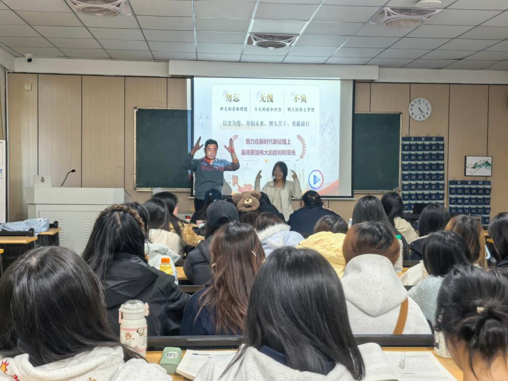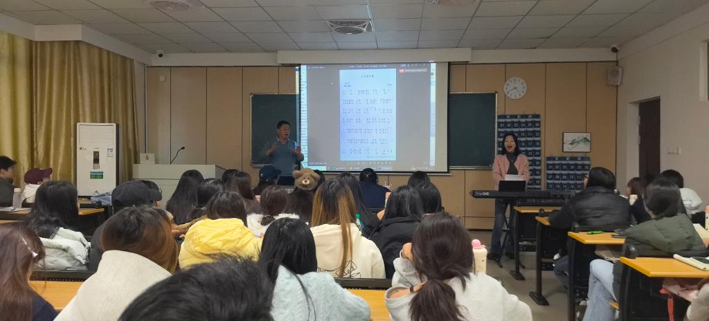这堂思政课跳出“说教式”传统框架,让艺术成为红色教育的“催化剂”。王松华副院长化身“课堂氛围引领者”,带领全体学生高唱《没有共产党就没有新中国》《团结就是力量》等经典抗战歌曲,激昂的旋律、整齐的合唱瞬间点燃全场热情;教育艺术系音乐教师周姝婕则发挥专业所长,手把手教唱《大刀进行曲》,从节奏把控到情感表达逐一细致指导,让同学们在铿锵有力的歌声中,切身感受中华儿女抵御外侮的铮铮铁骨与不屈意志。课堂上,歌声、掌声、感悟声交织共鸣,欢乐与激情双向奔赴,红色文化不再是遥远的文字记载,而是可听、可唱、可感的精神体验,氛围感拉满。