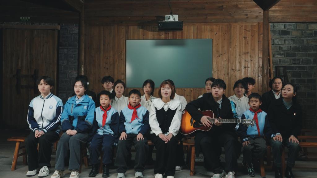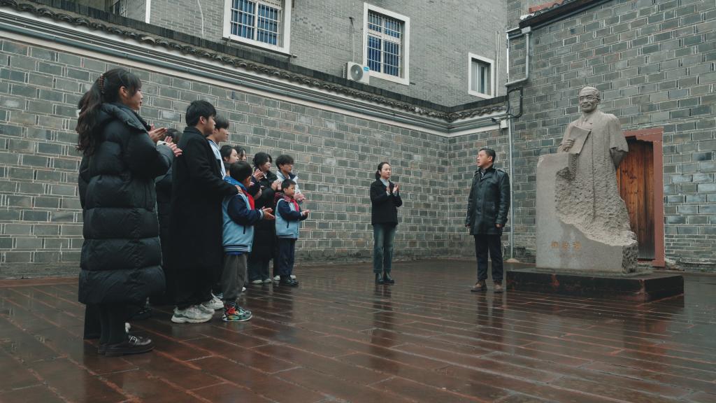 “这里住过一位法官爷爷,他去东京争一个座位。他说那不是一把椅子。那是中国高高的脊梁……”在故居庭院内,同学们列队而立,齐声朗诵原创诗歌《尊严的刻度》,并合唱经典歌曲《如愿》。朗朗诵读声与清澈歌声交织回荡,在宁静的院落中激起层层情感涟漪。思政课教师表示:“选择在梅汝璈故居开展朗诵与合唱,是希望同学们能以声音为载体,与历史人物展开跨越时空的对话,在艺术表达中深化对爱国精神与正义理念的理解。”